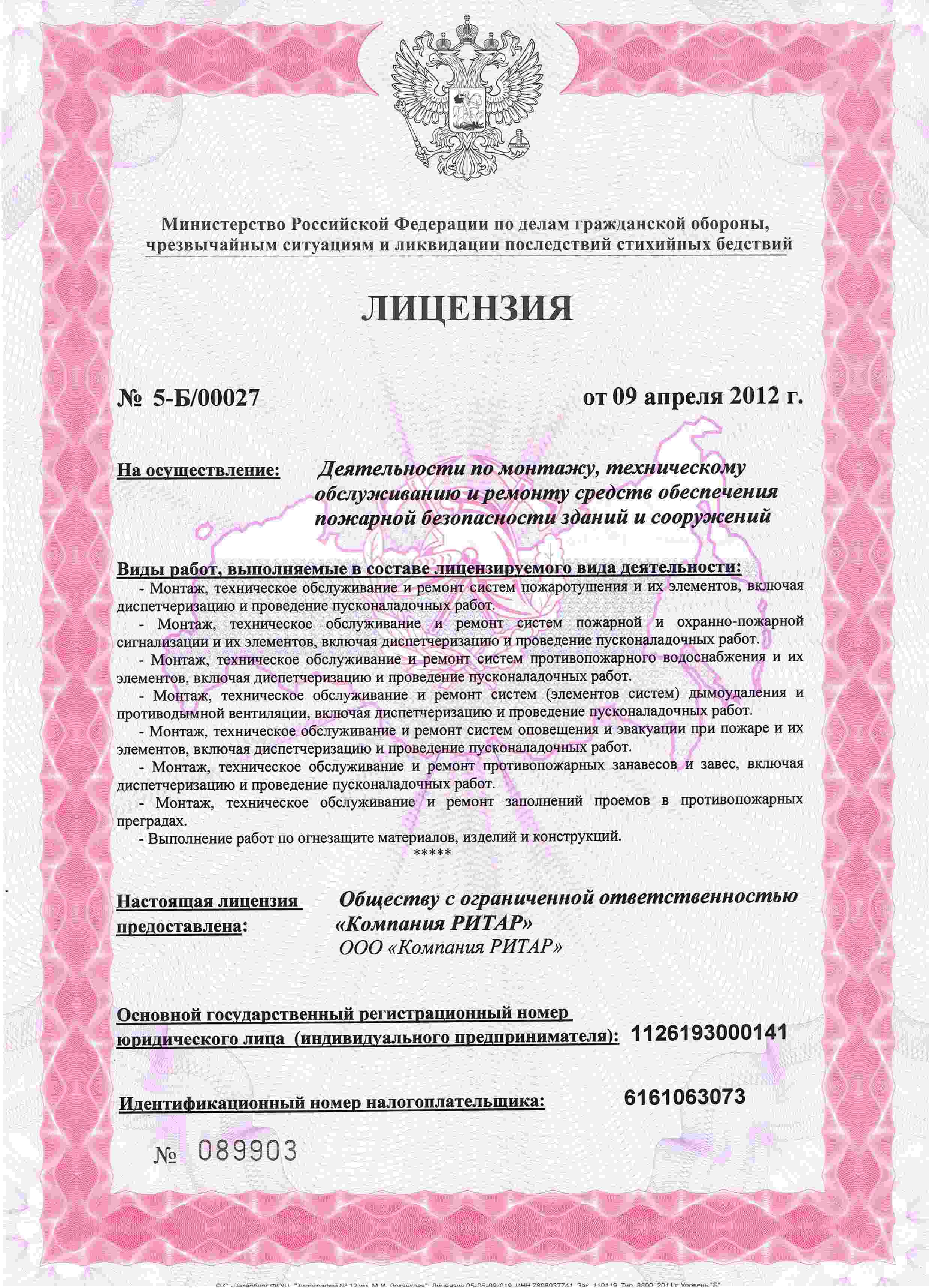 • Лицензия МЧС России № 5-Б/00027 от 09.04.2012